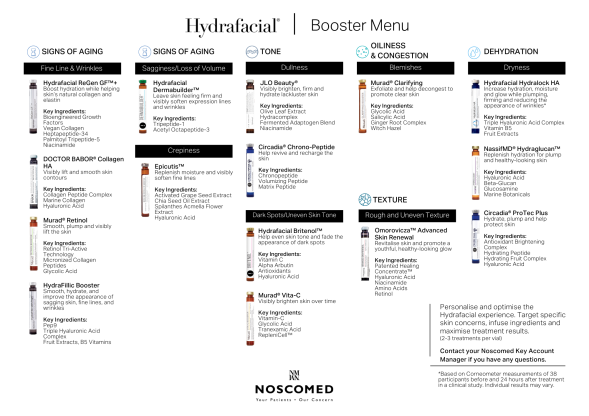 Boosters er specialiserede serumformuleringer, der målrettet behandler specifikke hudproblemer som pigmentering, fine linjer, dehydrering og ujævn hudtone. Ved at tilføje boosters til dine HydraFacial behandlinger kan du: